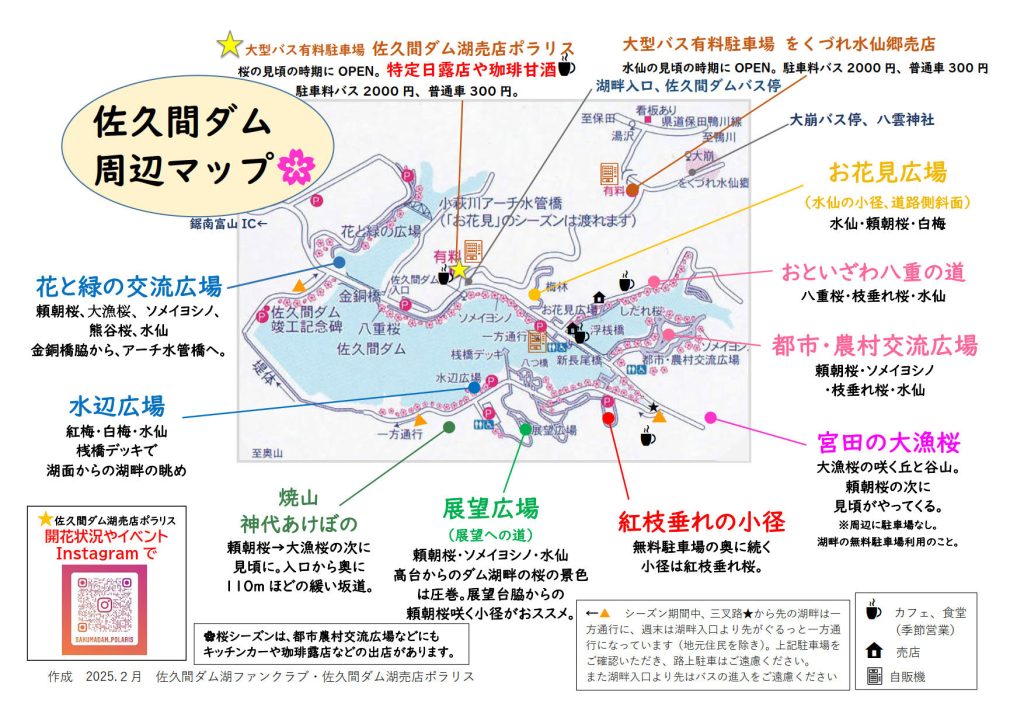 ※お詫び)地図の佐久間ダム周辺には駐車場場所など不案内な誤りがあります。水仙の小径ライトアップは、下記のお花見広場エリアですので近くまで来ましたら、下記のマップを参考になさってください。またバスでお越しの場合も花まつり期間中は下記のマップの有料バス駐車場をご利用ください。